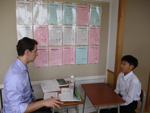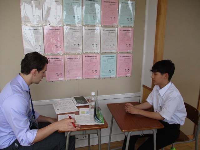 1年生の生徒はALTの先生と一人ずつPerformance Test を行いました。元気にALTの先生の質問に答えていました。待ち時間には、友達同士で練習をしていました。