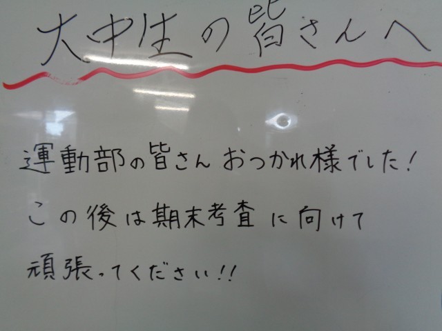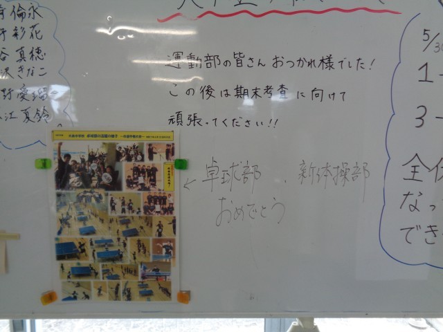 生徒会のホワイトボードのメッセージです。大会よく頑張りました。県選に出場する生徒は、次に向けて頑張りましょう。また、市民大会が3年生最後の大会です。3年間のれんしゅうの成果をだしきりましょう。