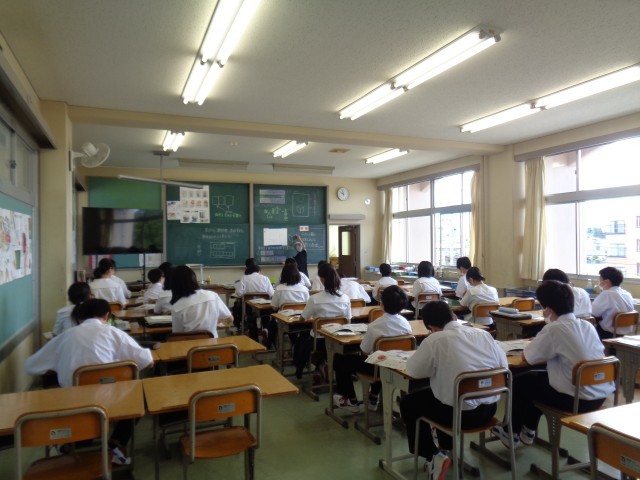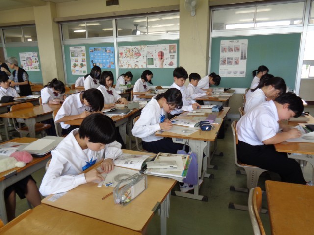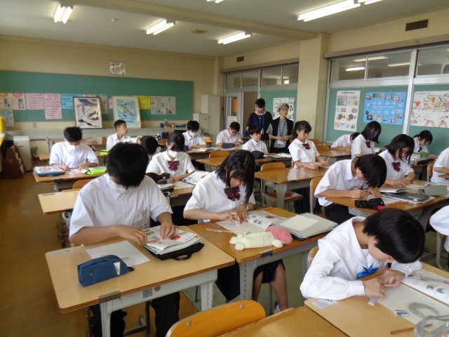 1年生の美術です。球や立方体の書き方を学んでいます。立方体を物差しを使わずに描いています。話をせずにすばらしい集中力で、しっかり手が進んでいました。みんな上手に描けていました。