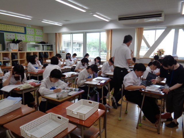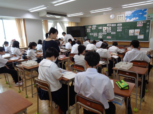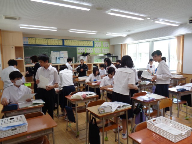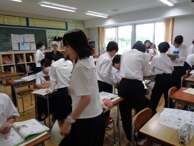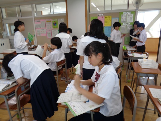 1年生の理科と英語です。理科では、問題の回答を先生に確認してもらいました。英語では、ペアになって会話の練習をしていました。