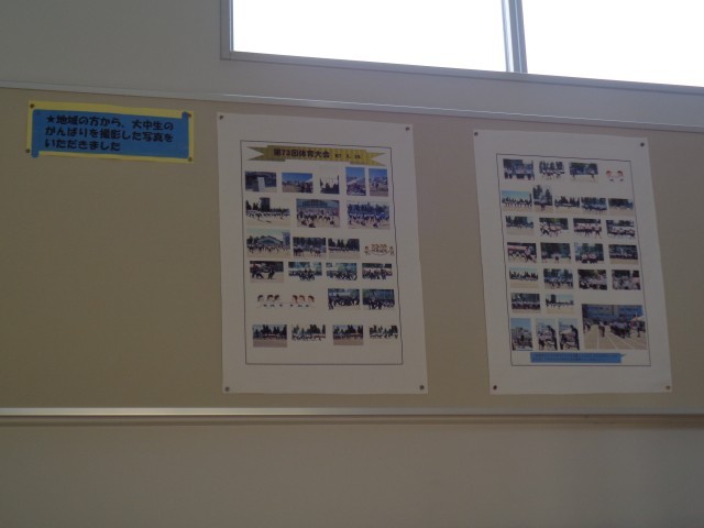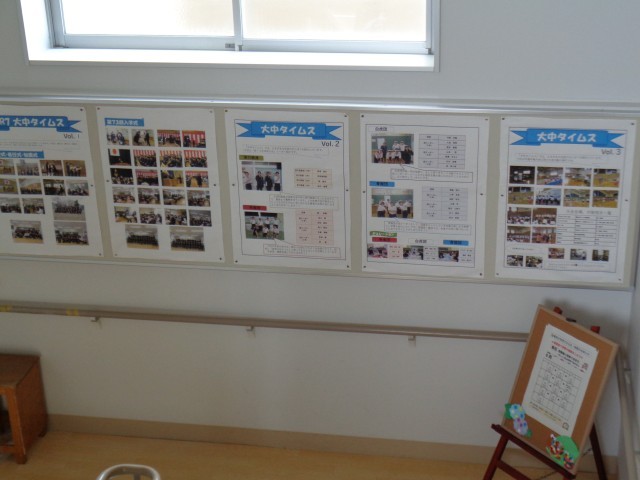 今週階段の踊り場に掲示板が設置されました。「大中タイムス」や地域の方からいただいた写真などを掲示しました。見やすくなりましたね。