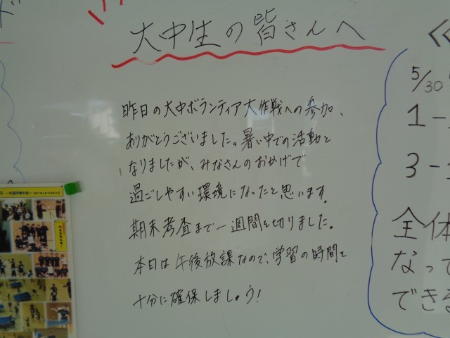 今朝の様子です。生徒会のホワイトボードには、昨日の大中清掃ボランティア大作戦への参加のお礼が書かれていました。今日は13:30下校完了です。放課後の時間をうまく使いましょう。