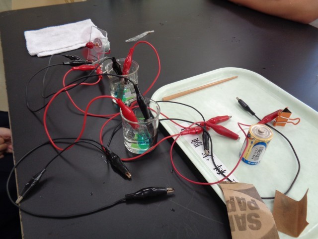 3年生の理科と数学です。理科では、理科室で実験していました。水溶液と金属板でモーターを回したり、オルゴールを鳴らしたりしていました。どんな仕組みなのでしょう??