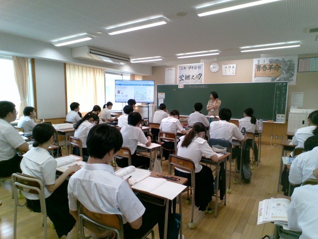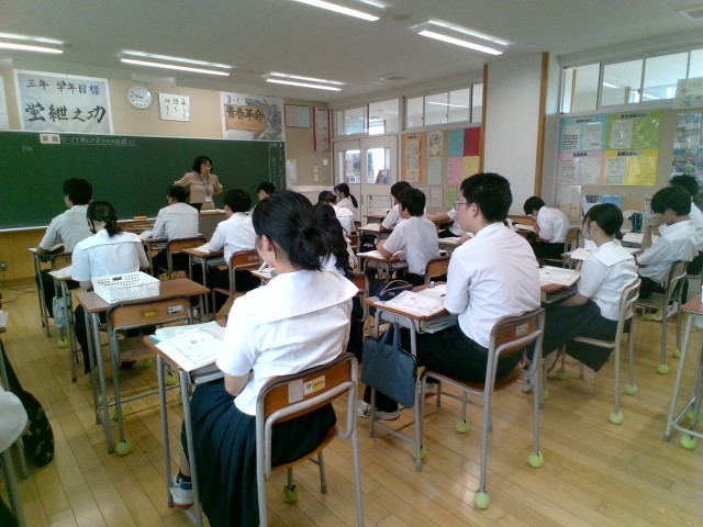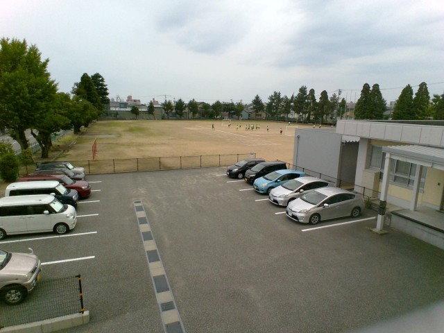 3年生の保健体育と英語です。保健体育は、グラウンドでサッカーをしています。途中で休憩とり、水分補給を行っています。