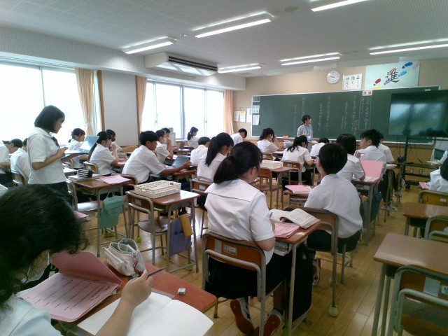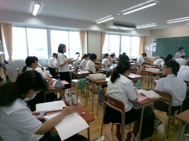 2年生の国語です。グループで話し合ったことを代表者が発表しています。発表者の方を向いて、話を聞いている生徒もいます。