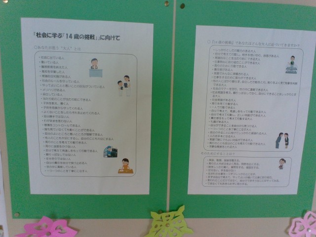 2年生の廊下には14歳の挑戦に向けての掲示があります。いよいよ来週です!!