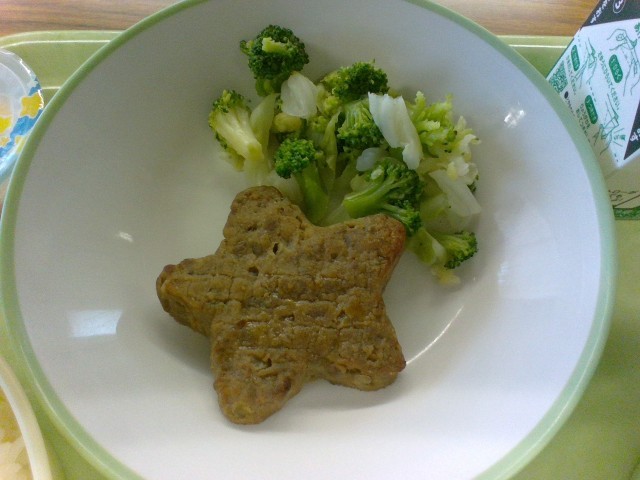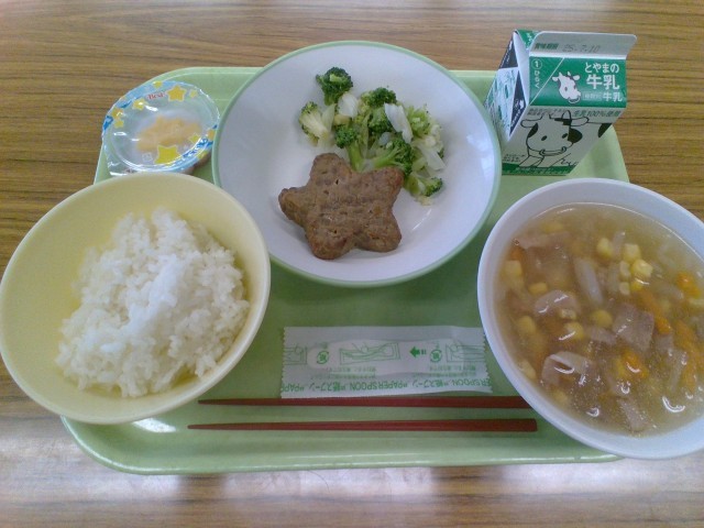 今日は七夕献立です。メニューはごはん、牛乳、星型ハンバーグ、そえ野菜、天の川スープ、七夕ゼリーでした。願い事を思いながら、美味しくいただきました。