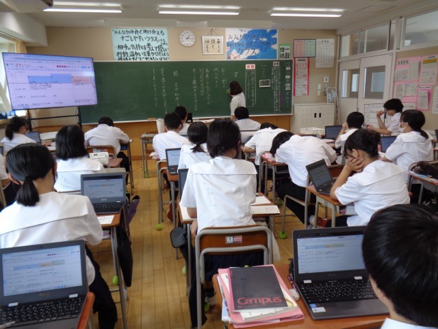 1年生の国語です。一人一人がタブレットで意見を入力しています。