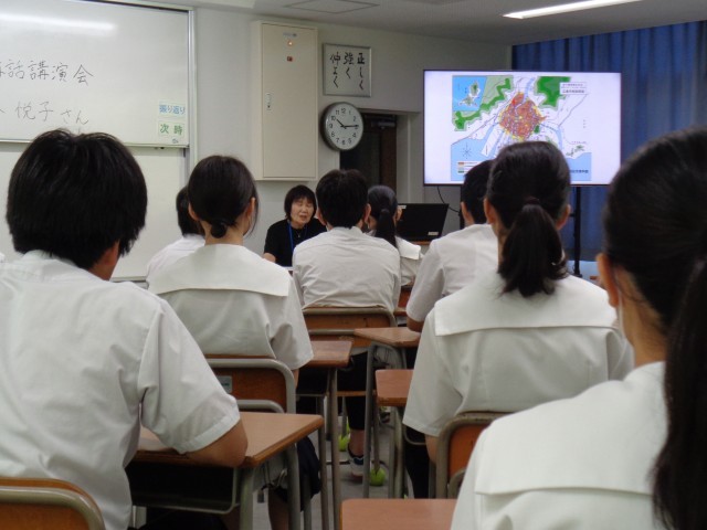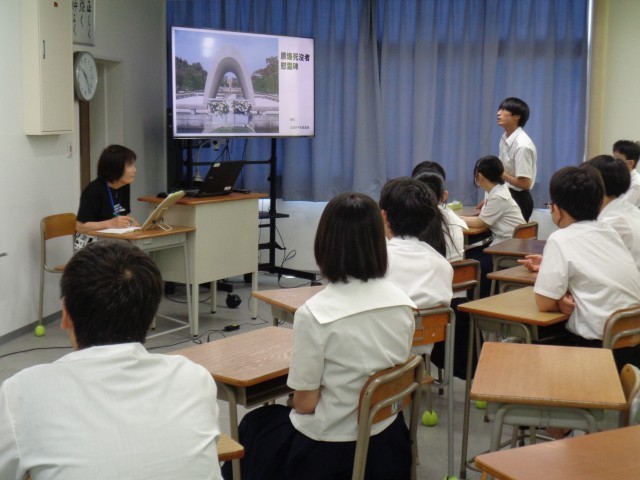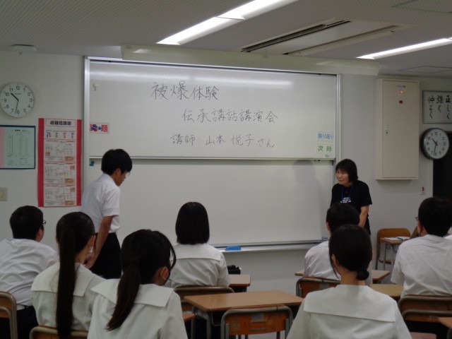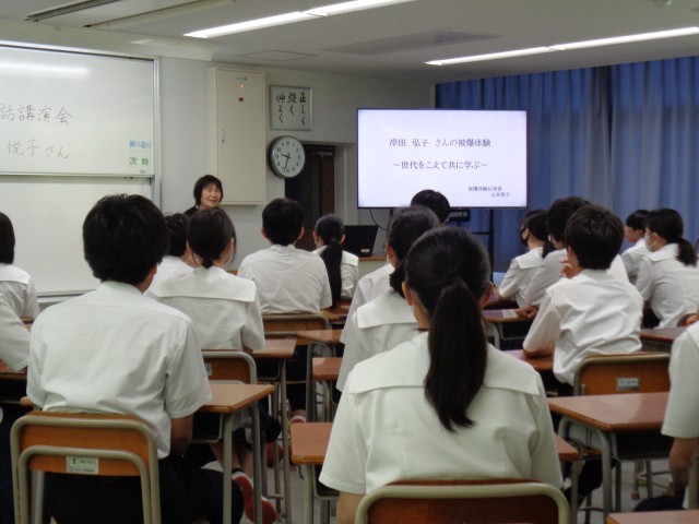 3年生の総合的な学習の時間です。今日は、広島市から被爆体験伝承者の方をお招きして、講話を聞きました。9月の修学旅行での平和学習の事前学習です。