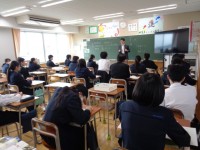 2年生の英語です。プリントに書き込みながら、授業を進めています。