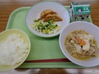 メニューはごはん、牛乳、揚げぎょうざ、カラフルサラダ、韓国風すき焼きでした。おい...