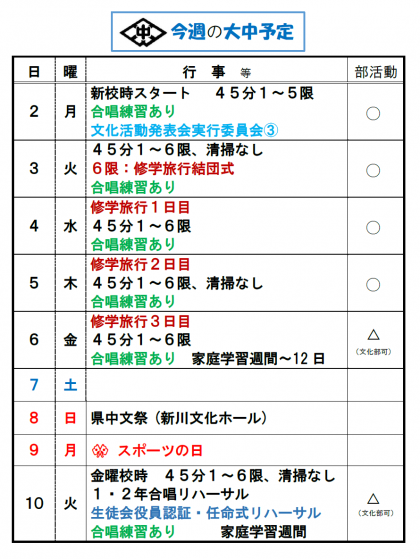4日(水)〜6日(金)に3年生は修学旅行に行きます。また、今週から合唱コンクー...