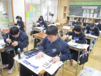 1年生の社会と国語です。国語は習字をしていました。書初め大会では「伝統芸能」と書きます。半紙に「伝統」の練習を静かに黙々と行っていました。新年の大会までにしっかり練習しておきましょう。