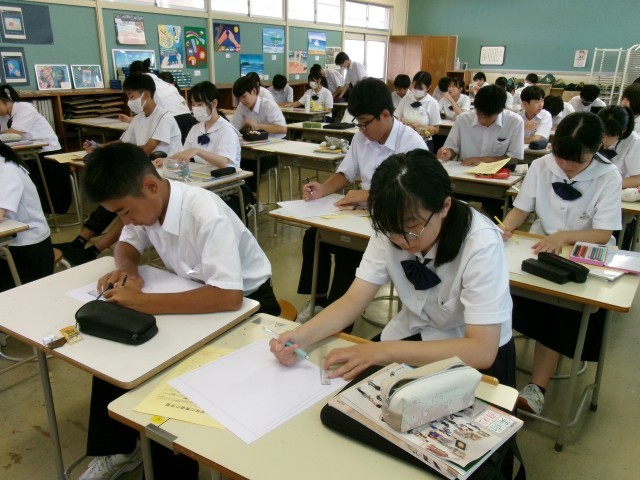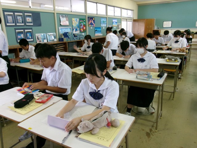 7月14日(月)授業の様子(2学年) 公開日 2025/07/14 更新日 2025/07/14 学び合い認め合う学習 美術の授業の様子です。平面構成の下書きに配色計画をしていました。ここまで頑張って、夏休みの宿題を終わらせようと集中しています。