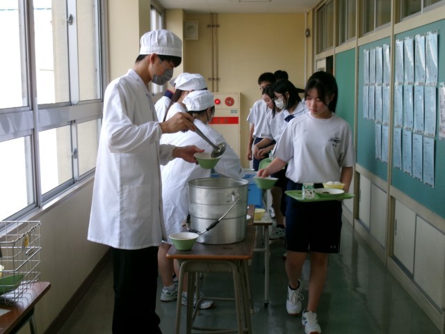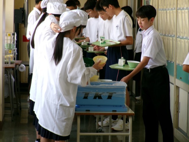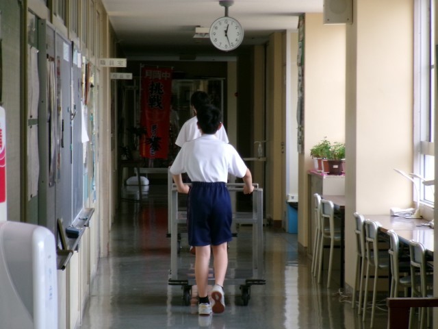 給食のワゴンを片付けたり、配膳したり給食前の光景です。協力して行っています。