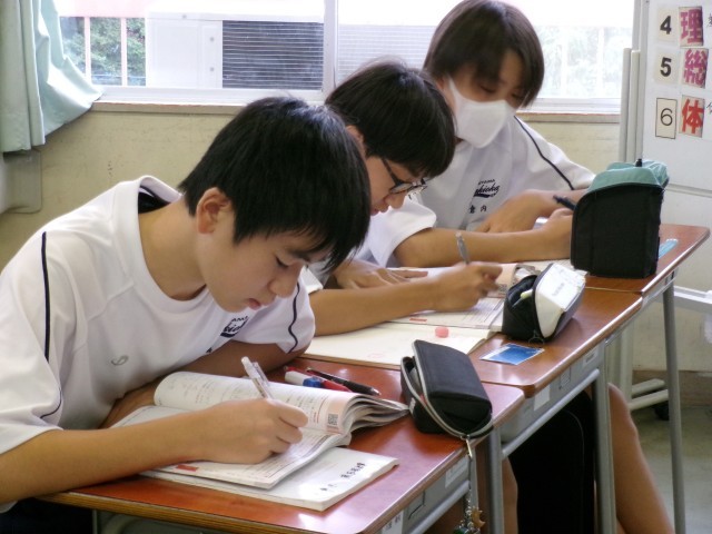 9月5日(金)授業の様子(1学年) 公開日 2025/09/05 更新日 2025/09/05 学び合い認め合う学習 数学の授業の様子です。各自、問題演習をしたり先生に聞いたりして取り組んでいました。2つの条件をそれぞれ式に表せるかが重要ですね。