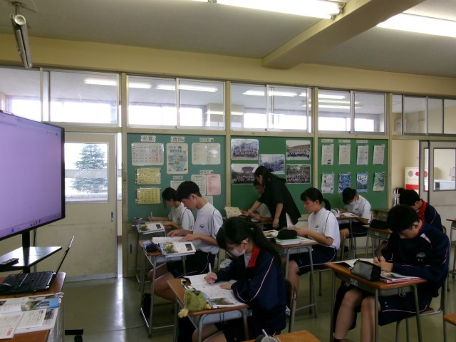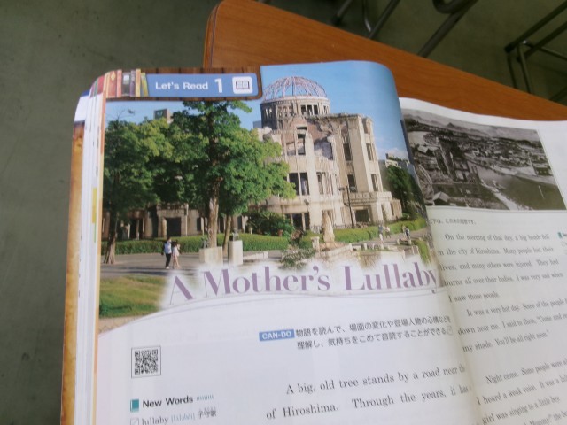 英語の授業の様子です。80年前の広島について学習していました。「Ā Mother’s Rullaby」どんな意味なのかな、と思って調べるとRullabyは、「ララバイ」、「子守歌」でした。このタイトルだけで、悲しくなってしまいました。