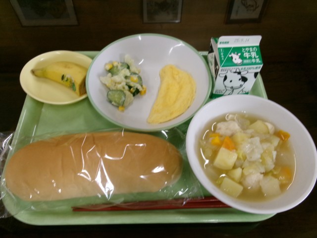 9月8日(月)今日の給食 公開日 2025/09/08 更新日 2025/09/08 今日の給食 野菜のスープ煮には、たくさんの野菜と肉団子が入っていました。味が染みていておいしかったです。ちなみに、今日はシール付きのバナナで、なんか当たりの気分でした。フィリピン産のバナナでした。<今日の献立>コッペパン牛乳チーズオムレツカラフルサラダ野菜のスープ煮バナナ