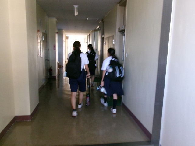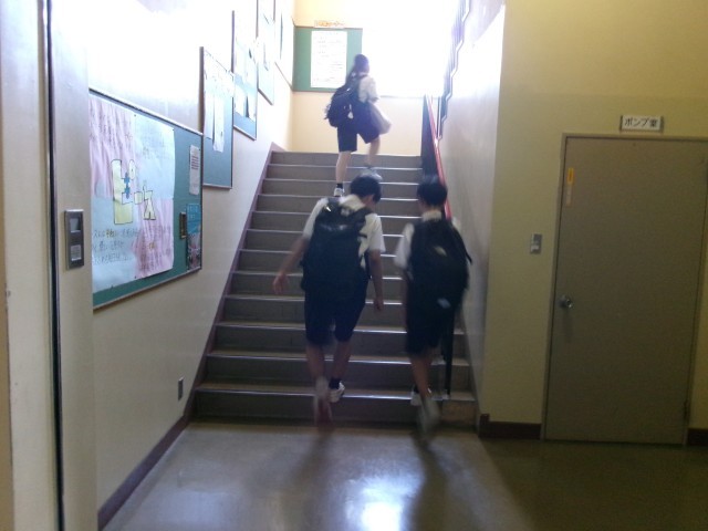 登校した生徒は、玄関から、すぐの階段を上がってそれぞれの教室に向かいます。まぶしい光が差し込んでいます。