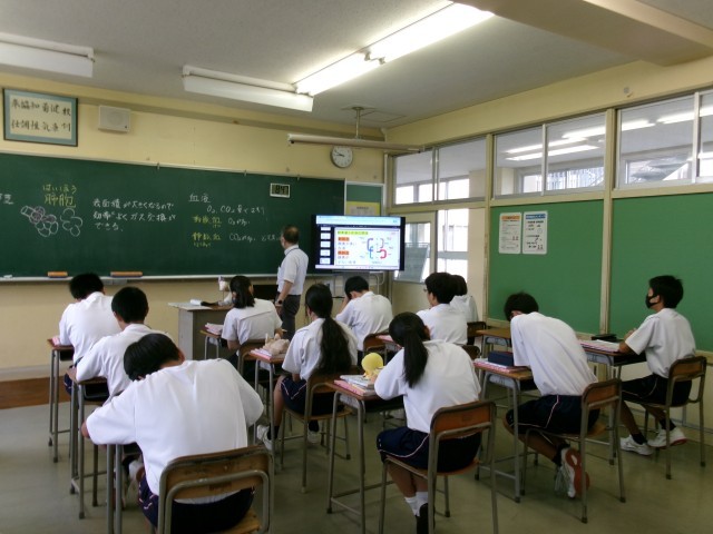 今年度、2年生も理科と英語の授業を少人数クラスで行っています。写真の1枚目は理科、2・3枚目は英語の様子です。英語はペアで会話練習をしているところでした。決まっている文にもう一文追加して話しています。