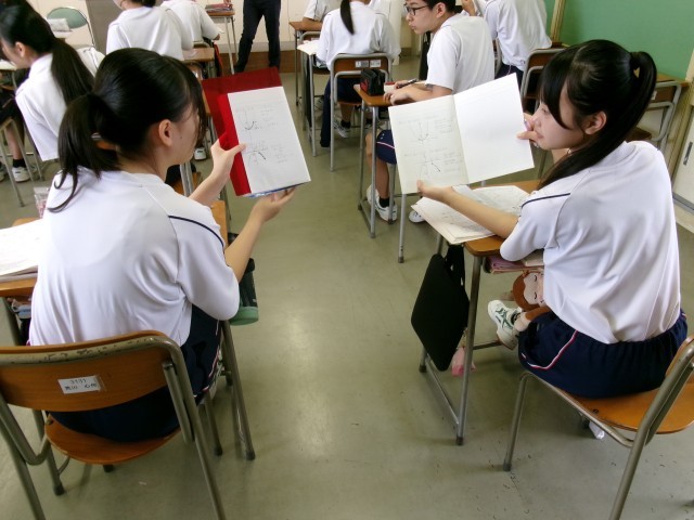 数学の授業の様子です。自分で導き出した答えが、合っているか座席の隣、前後で確認しているところです。笑顔は、答えが一緒だった安心感の表れかな。この後、全体で確かめました。