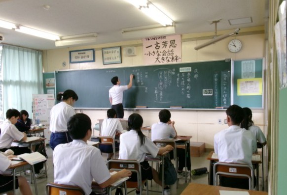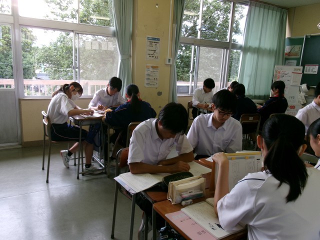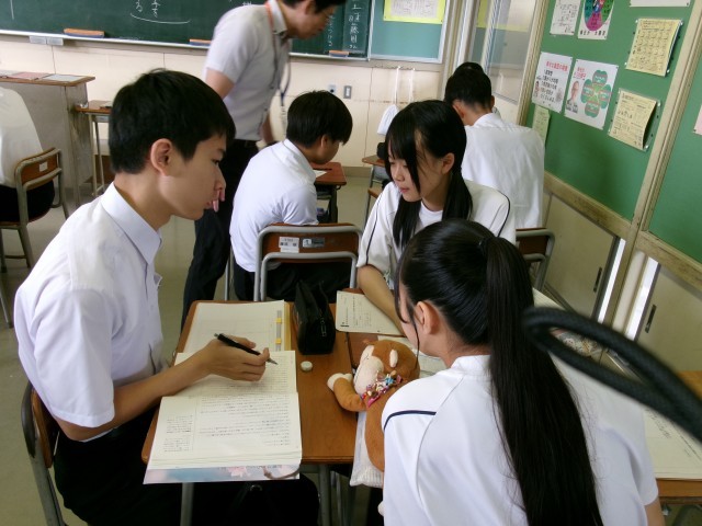 国語の授業の様子です。まずは一人一人がノートに自分の考えを書き、次に班で考えの交流をし、最後に全体で自分の意見を発表していました。