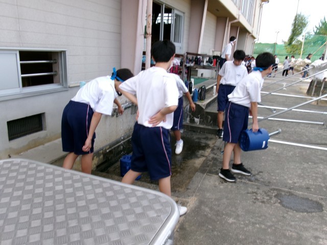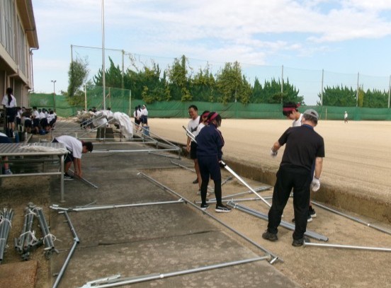 テント設営を全校生徒で行いました。2・3年生が団や本部等のテントを、1年生がテントのおもりを設置しました。あっという間に準備ができました。素晴らしいです。