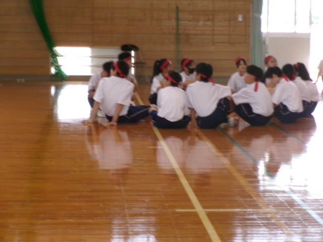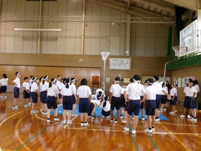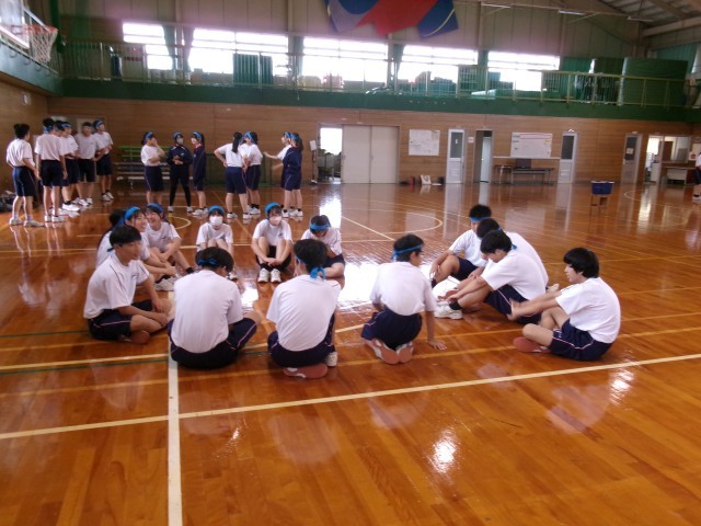 シューティングリレー練習を全校生徒で行いました。リーダーを中心に作戦会議をする団、実際に投げてみる団、練習を重ねています。笑顔が多い、いい時間です。