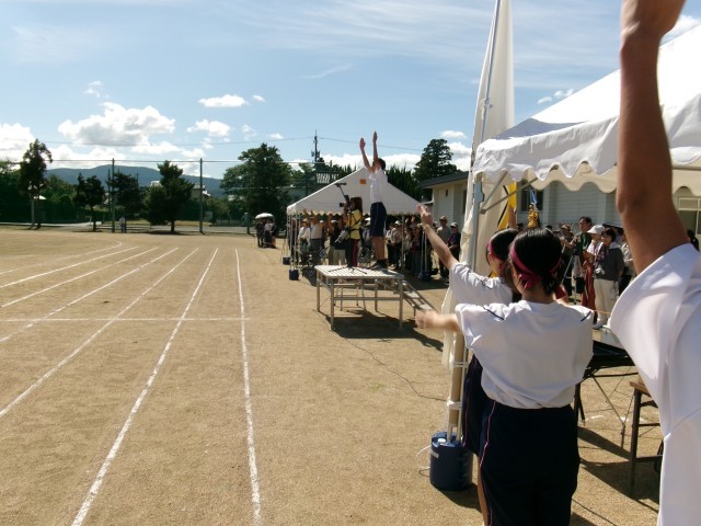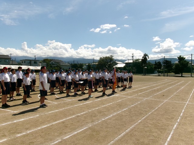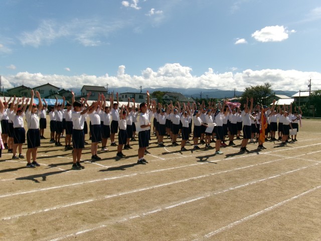 実行委員による講評の後、全員で大きな声で校歌を歌いました。さらに、後援会や自治振興会の方と共に声高らかに万歳三唱をし、実行委員長の言葉で閉めました。みんなで、Break the limitという同じ目標をもって、頑張ることができた体育大会だったと思います。「さわやかな空と同じくらいさわやかな子供たちだった」と、来賓の方からほめていただきました。これからも、今日の笑顔を忘れずに、みんなでよい月岡中にしていきましょう!