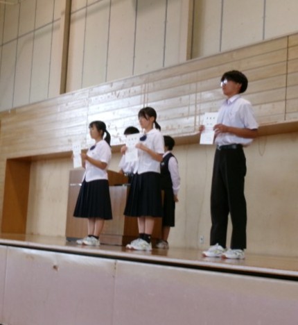 10月3日(金)生徒会役員任命式・委員長委嘱式 その3 公開日 2025/10/03 更新日 2025/10/03 生徒の活動紹介 生徒会長から、新委員長へ委嘱状を授与しました。いよいよ、2年生が生徒会活動の中心になります。頑張れ、2年生!