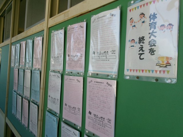 体育大会の振り返りや写真が掲示してあります。みんなの本気が見られた体育大会でした。