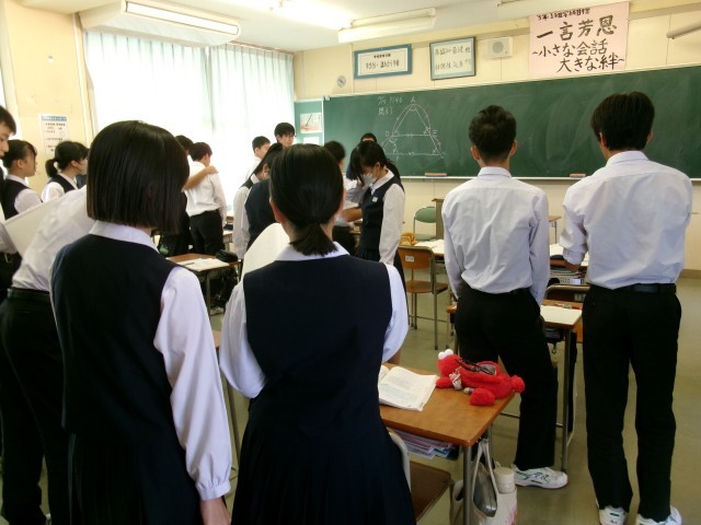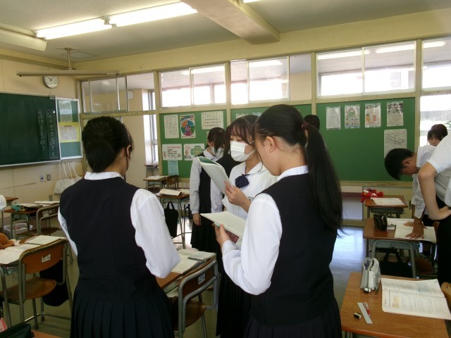 数学の授業の様子です。証明問題の学び合いをしていました。証明のパターンのどれを使えばよいのか、ひらめきも大切です。たくさんの問題に接していくと、コツがつかめるはずです。頑張れ!