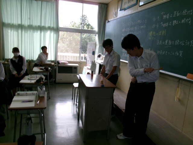 理科の授業の様子です。「慣性の法則」の学習中でした。昔のテレビ番組で、コップが並んだテーブルクロスを引く芸をよく見ましたが、これも慣性の法則だったのか・・・。今日は、だるま落としで現象を確認していました。