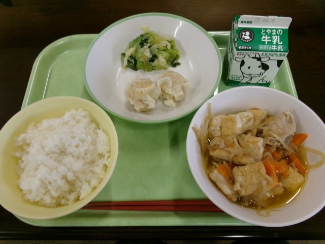 10月24日(金)今日の給食 公開日 2025/10/24 更新日 2025/10/24 今日の給食 厚揚げがいっぱい入ったうま煮です。厚揚げの中が熱くて、ほくほくでした。教室では、今日の学習発表会のことを話しながら食べているかな。<今日の献立>ごはん牛乳コーンシューマイ香味和え厚揚げのうま煮