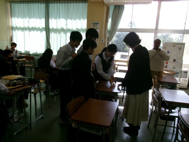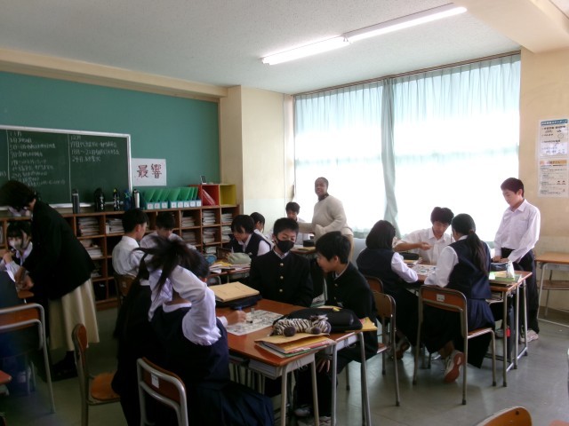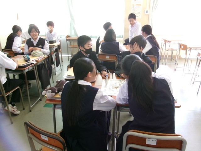 英語のALTの先生との授業です。すごろくゲームをしていました。そして、班で一番だった人がご褒美をとりに来ていました。笑顔いっぱいでした。