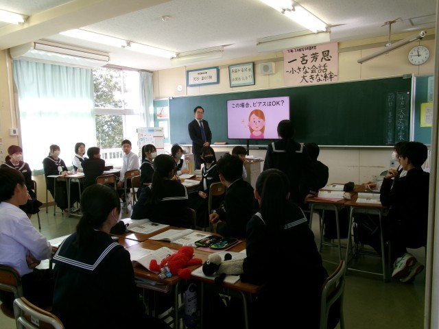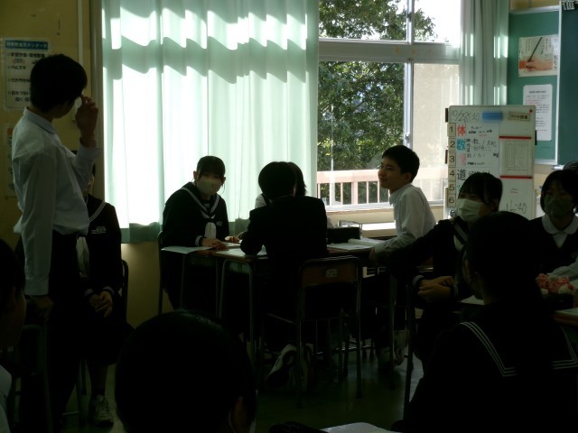 班で意見を交流しているにぎやかな声につられて、教室へ。自分の意見を紹介しているところでした。聞く人たちも楽しそうです。〇〇はよいか、だめか…、選んだ理由等が一人一人違っていて面白そうでした。