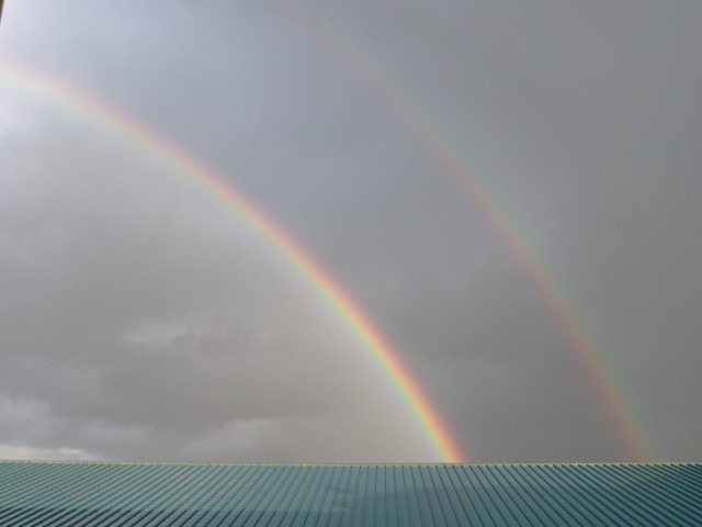 なんと、今日はダブルレインボー! 雨上がりの空に太陽光が差し込み、水滴が豊富なとき、雨粒の中で太陽光が2回反射することで色が反転した虹が現れるそうです。だから、2つの虹は、赤が外側のものと内側のものでした。見ましたか?🌈