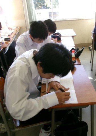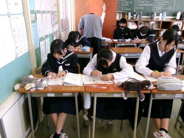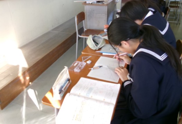 数学の授業の様子です。コンパスや定規を使って、作図に取り組んでいました。できた人が挙手をして、担当の先生に確認してもらっています。
