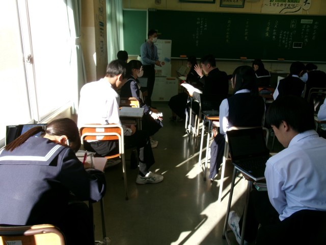国語の授業の様子です。和歌集について調べ、互いに調べたことを伝え合っていました。「藤原定家」「後醍醐天皇」「源通具」等の名が出てきていました。つくられた時代背景を知ると、ぐっと和歌の理解が深まりそうです。