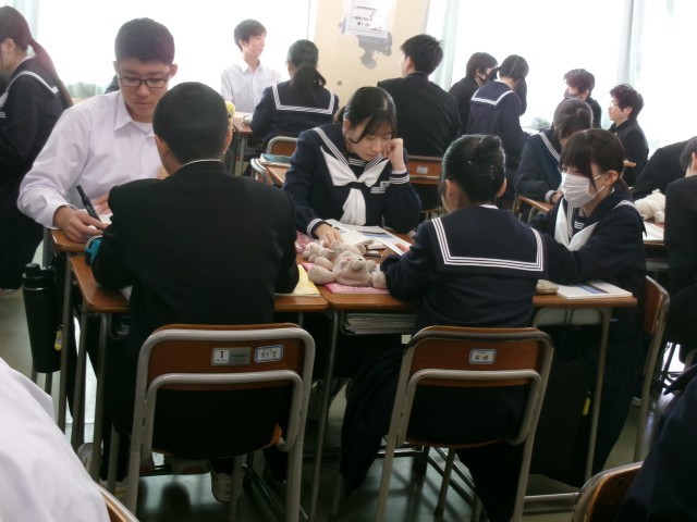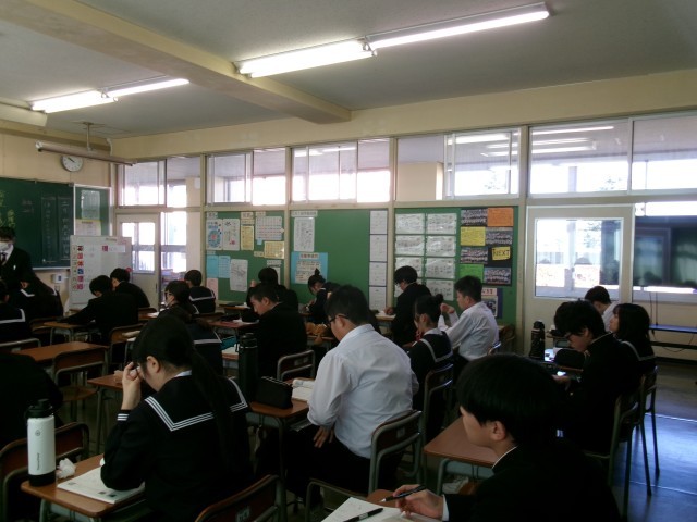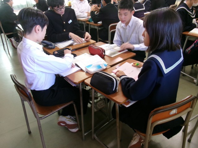国語の授業の様子です。論説文についての説明を聞き、次はグループで「どこまでが序論なのか」「結論は?」などを話し合っていました。私は、国語の読み取りが苦手で、中学、高校の頃は苦労しました。