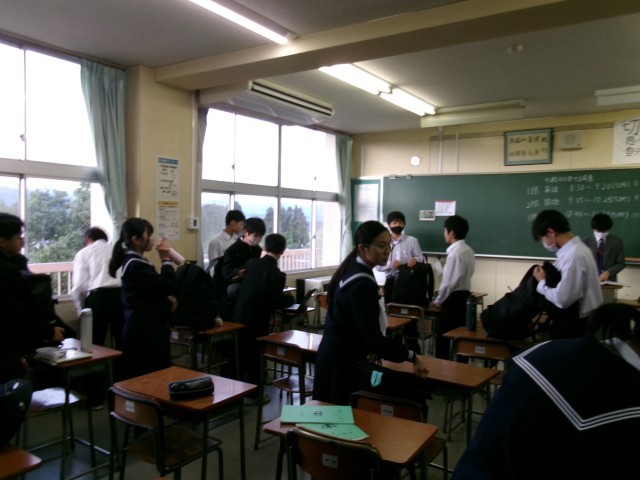 登校して、荷物整理をしていました。特に今日は、調査があるので机の中もきれいにしています。
