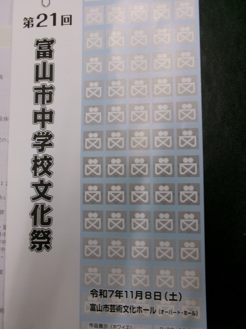 11月7日(金)富山市中学校文化祭 公開日 2025/11/07 更新日 2025/11/07 月中日誌 明日11月8日(土)、富山市中学校文化祭がオーバードでホール行われます。2年生は合唱発表、茶道部はお茶席を行います。また、美術、手芸、書道作品も展示してありますので、どうぞご覧ください。