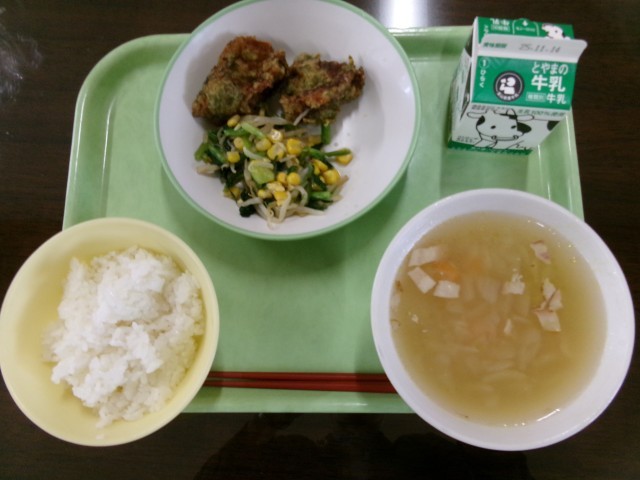 11月7日(金)今日の給食 公開日 2025/11/07 更新日 2025/11/07 今日の給食 3日ぶりの記事になります。豚肉の磯辺揚げが香りもよく美味しくいただきました。<今日の献立>ごはん牛乳豚肉の磯辺揚げコーン和えポテトスープ