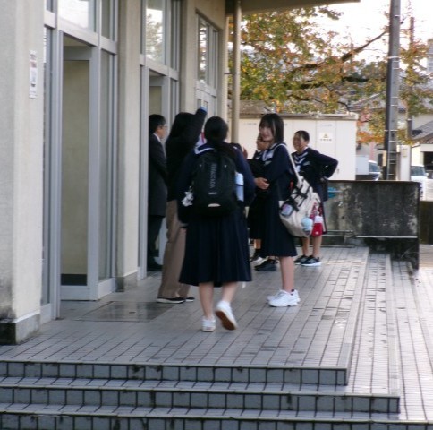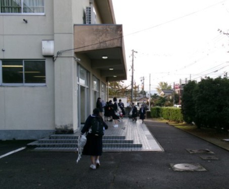 登校の様子です。玄関では、笑顔で会話する生徒が多いです。
