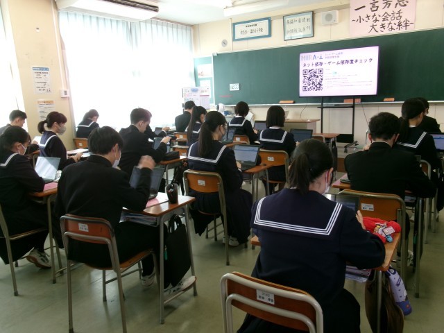 ネットやゲーム依存について考えるとともに、自分たちはどうなのか「ネット依存・ゲーム依存度チェック」をしていました。どんな結果が出て、どんな意見が出たのか、聞いてみてください。