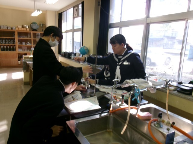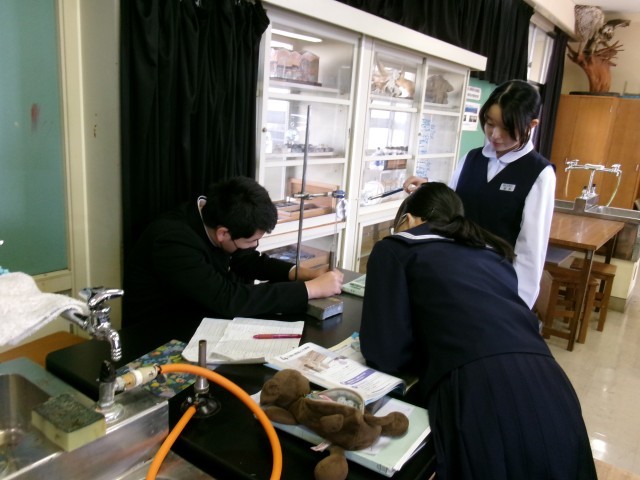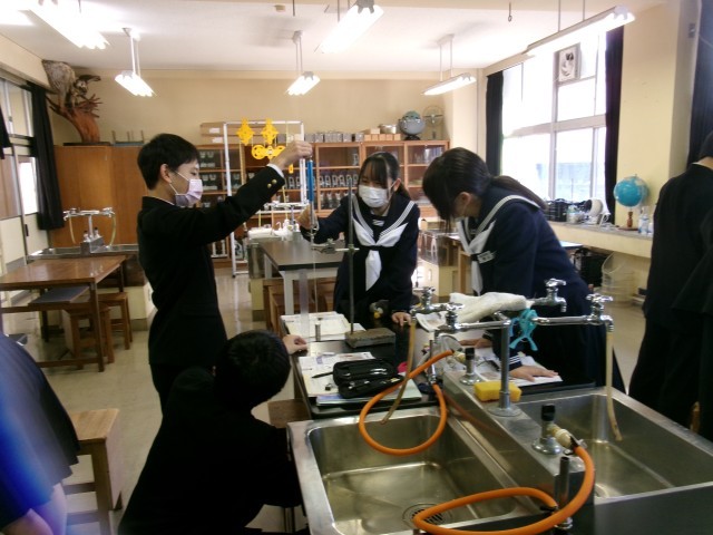 理科で実験をしている様子です。滑車とばねばかりを使って、仕事量を求める実験でしょうか。おもりを決まった高さまで持ち上げて測るのでしょう。「〇〇センチ!」という声も聞こえました。