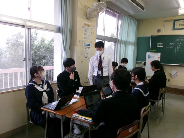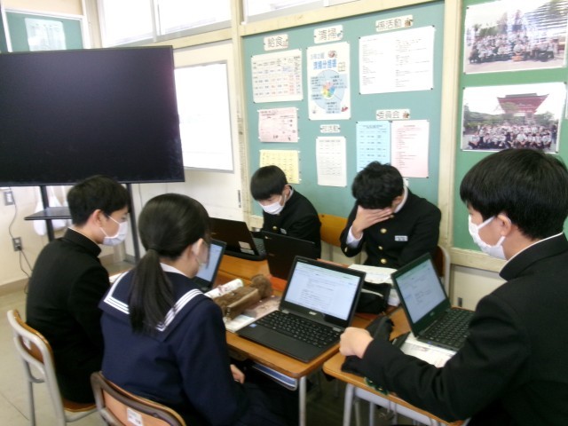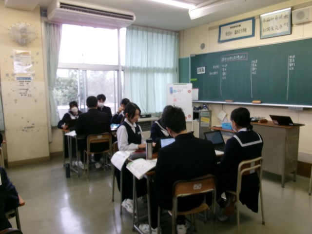 社会の授業です。「裁判員になったとして事例の判決を考えよう」という課題で、考えていました。「正当防衛を認めるには?」「有罪にするための根拠は?」など、意見を述べ合っていました。