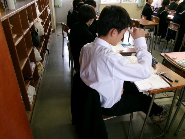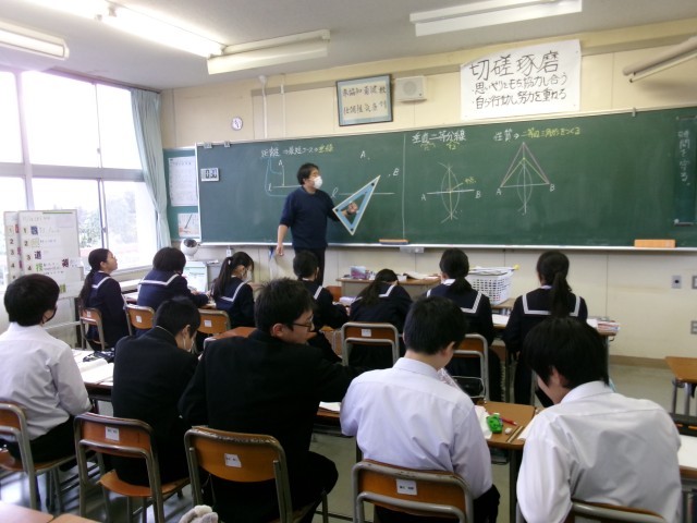 数学の授業です。コンパス、定規を使って作図をしてました。