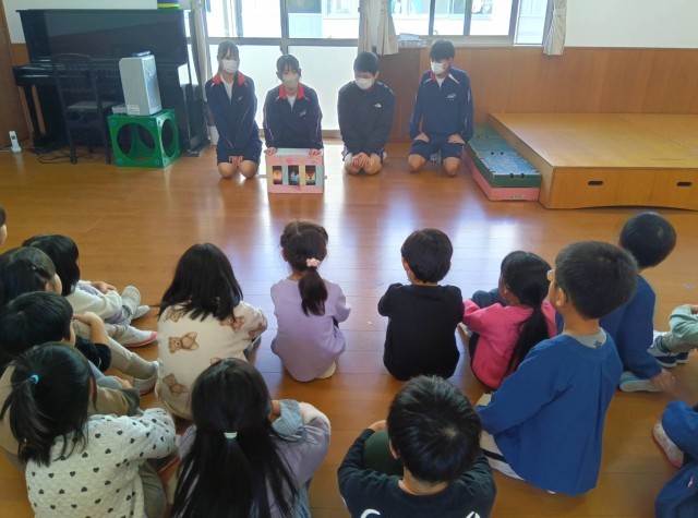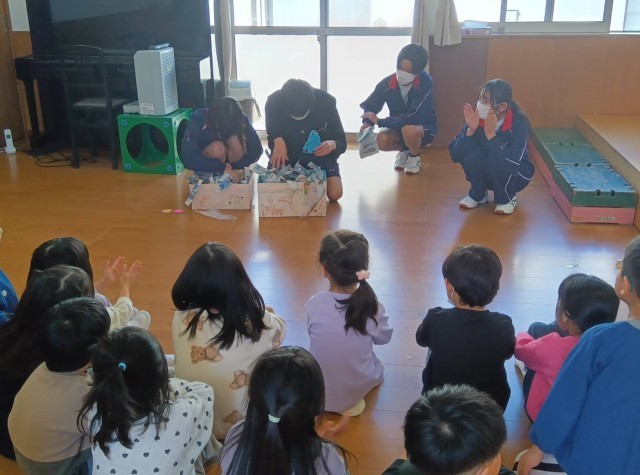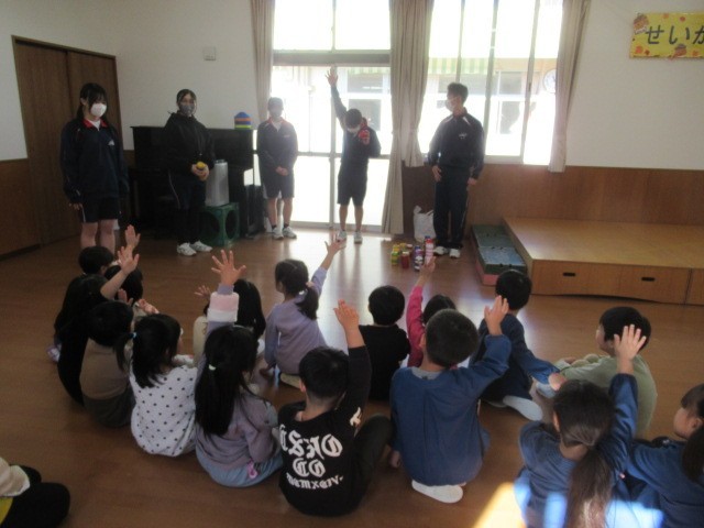 保育所訪問の様子です。自分たちがつくったおもちゃの使い方等を説明して、実際に遊んで見せました。分かりやすい説明を一生懸命考えました。その説明を園児たちが一生懸命聞いてくれたり、拍手をしてくれたり、とてもよい体験になりました。笑顔になります。園児のみなさんも、きちんとお座りしていて、とても、かわいらしです。