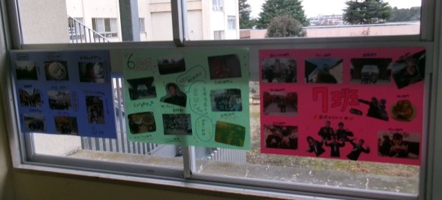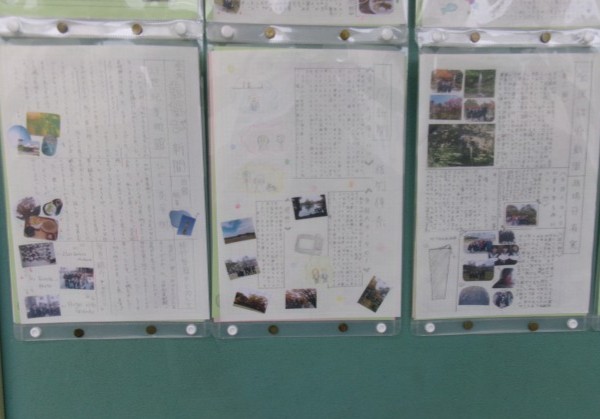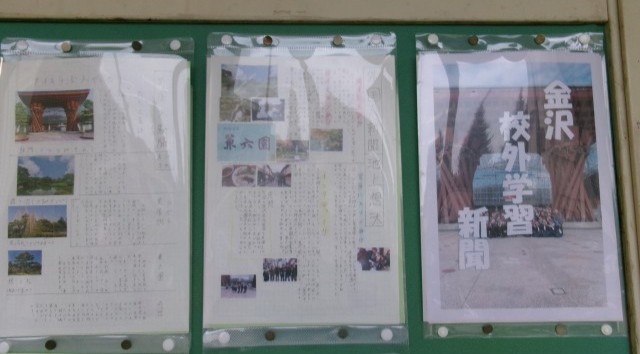 2年生教室前には、金沢校外学習のまとめとして個人新聞や班の写真集が掲示してあります。笑顔いっぱいの写真が多く見られ、充実感が伝わります。